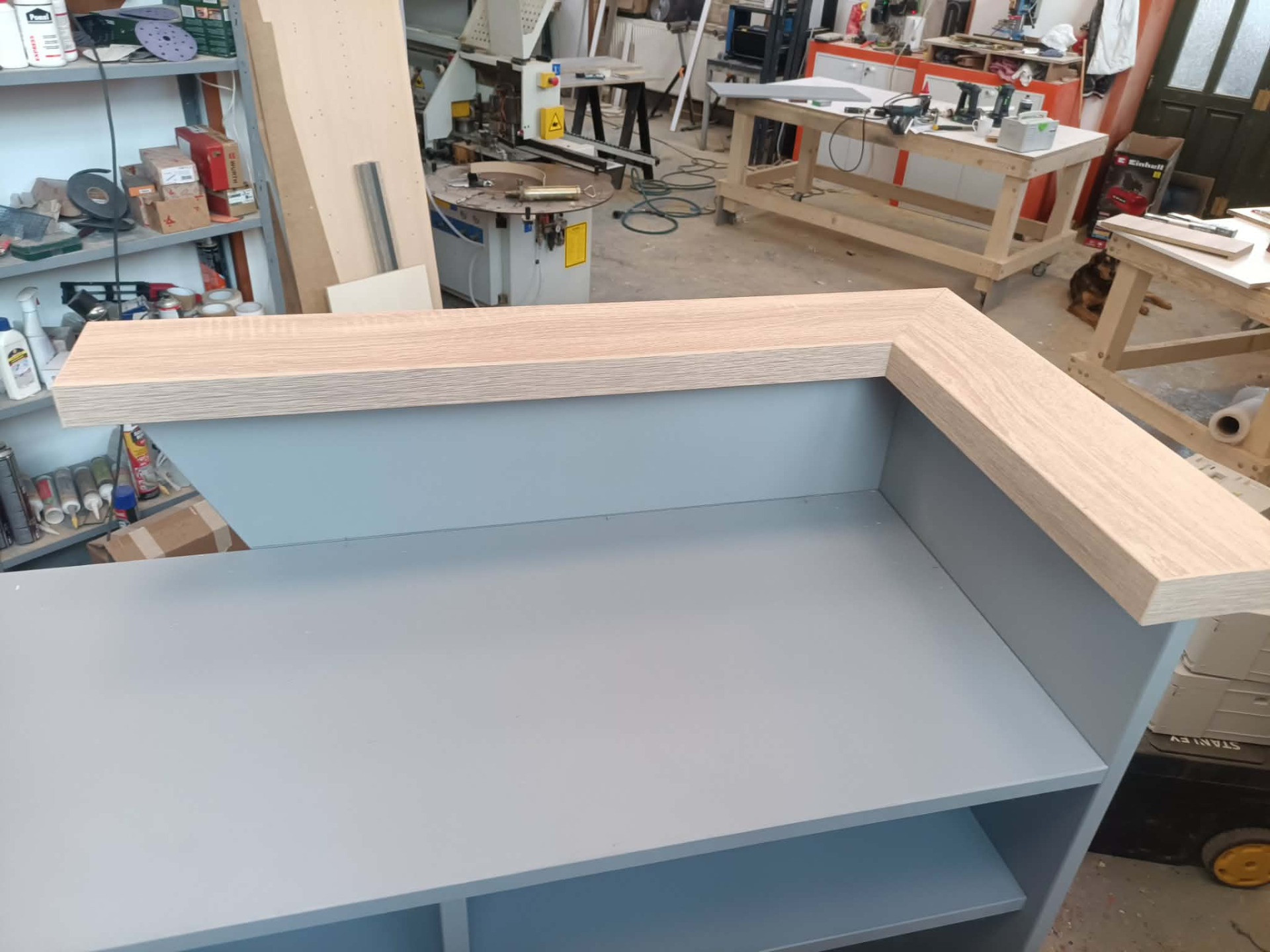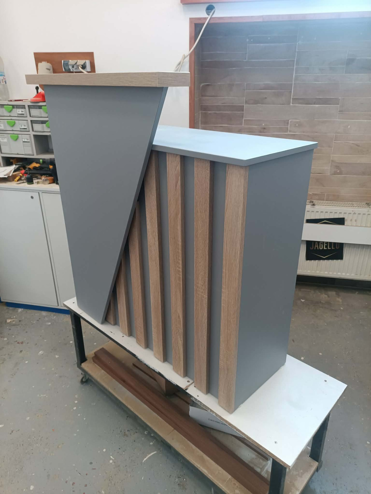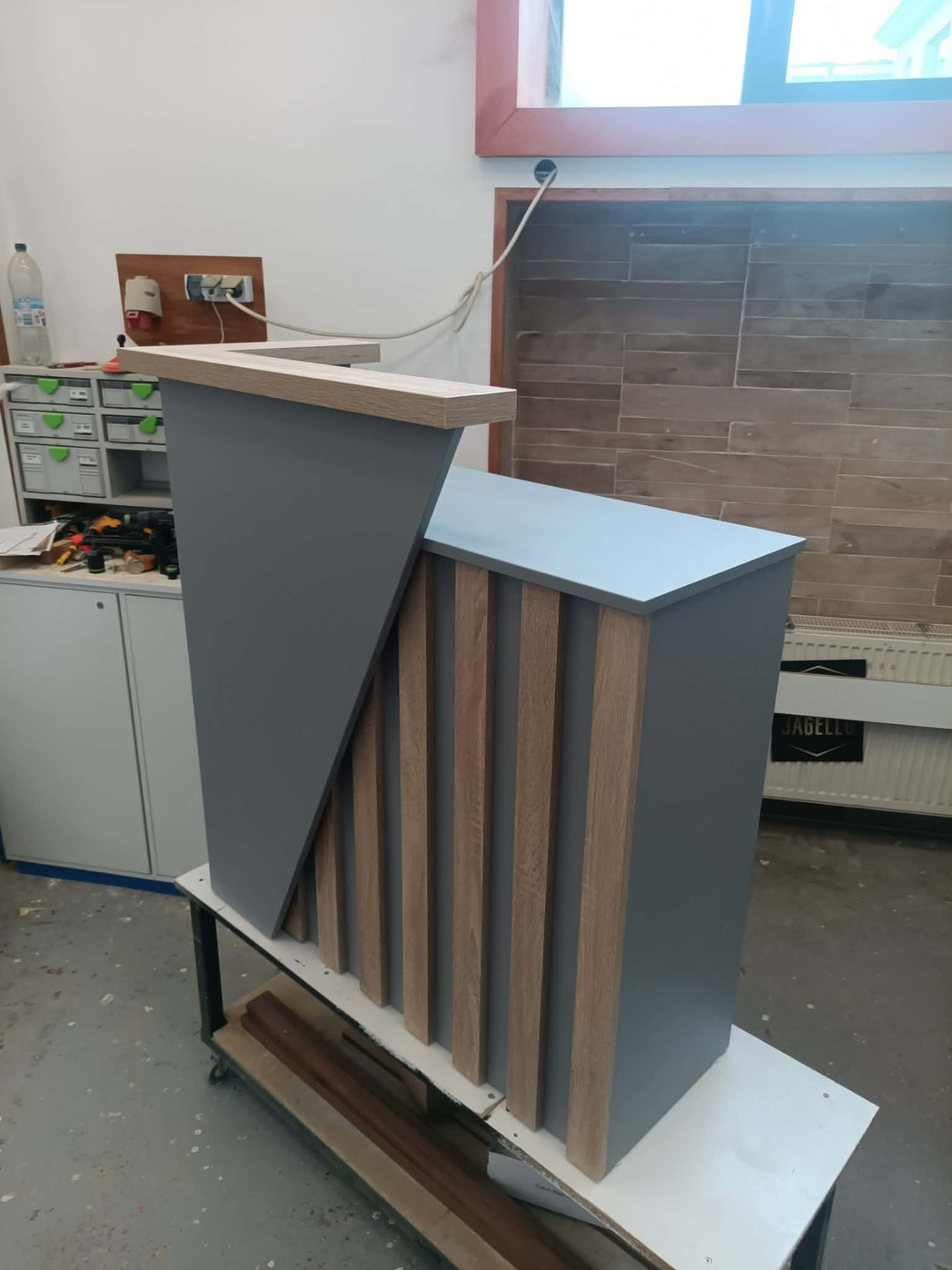 Falco Design Egérszürke 278 FS08 alapfelület,Falco Design Világos Vintage Tölgy 577 FS22 dekorcsíkokkal és könyöklővel. Szélessége 100cm, mélysége 40cm. Pult magassága 90cm, előlap magassága 110cm. Igény esetén kérhető ledvilágítással, illetve belső fiókkal is.