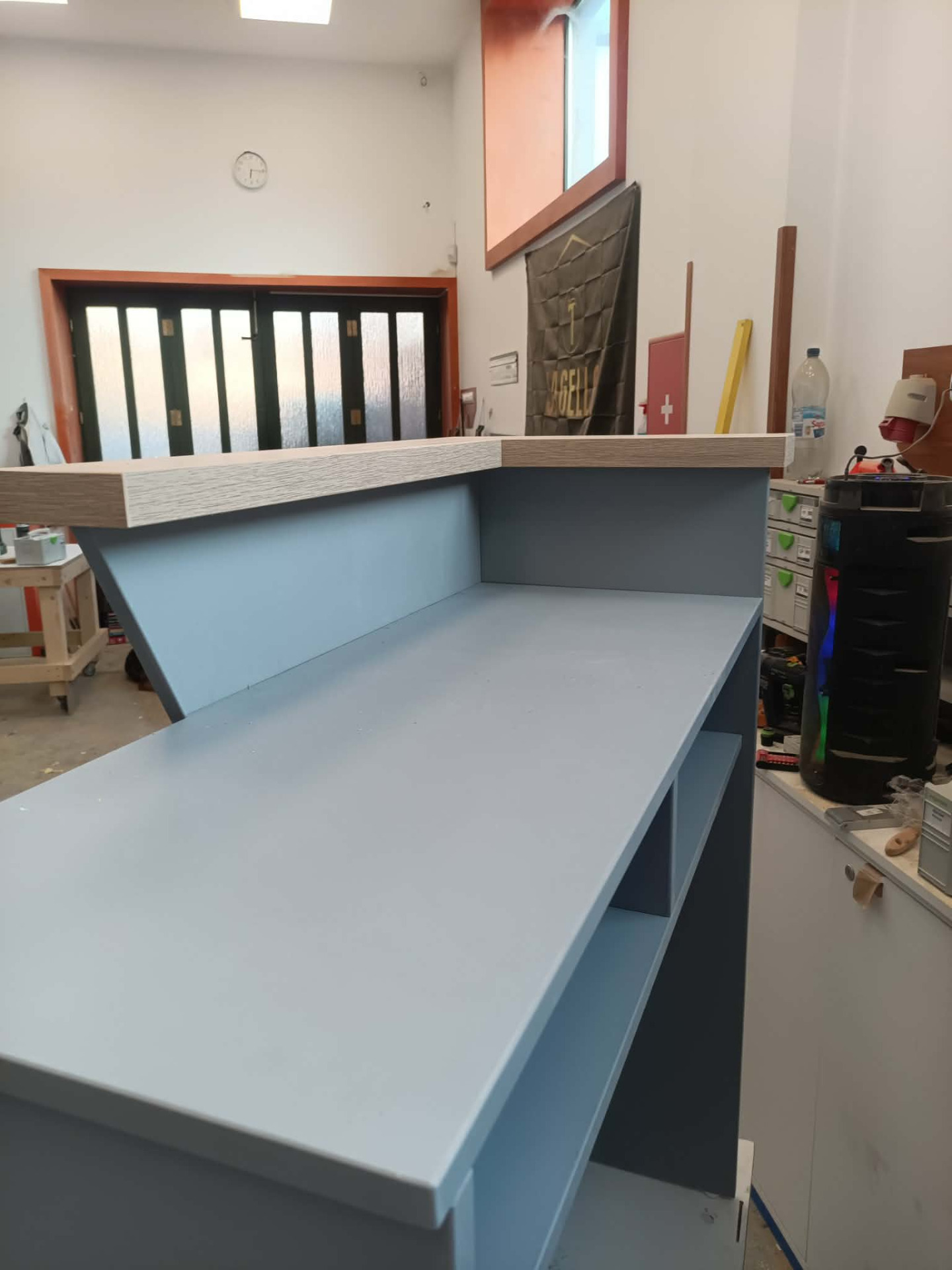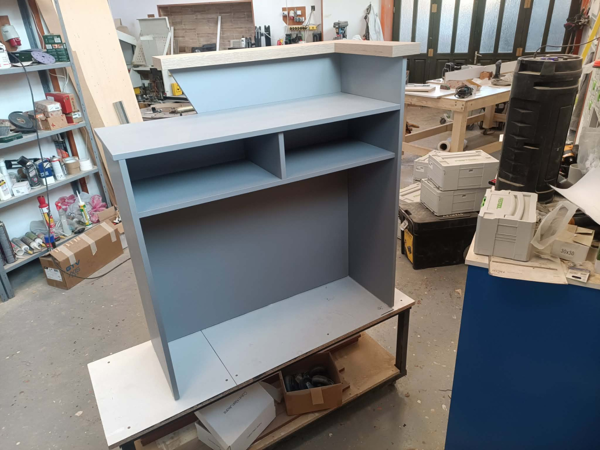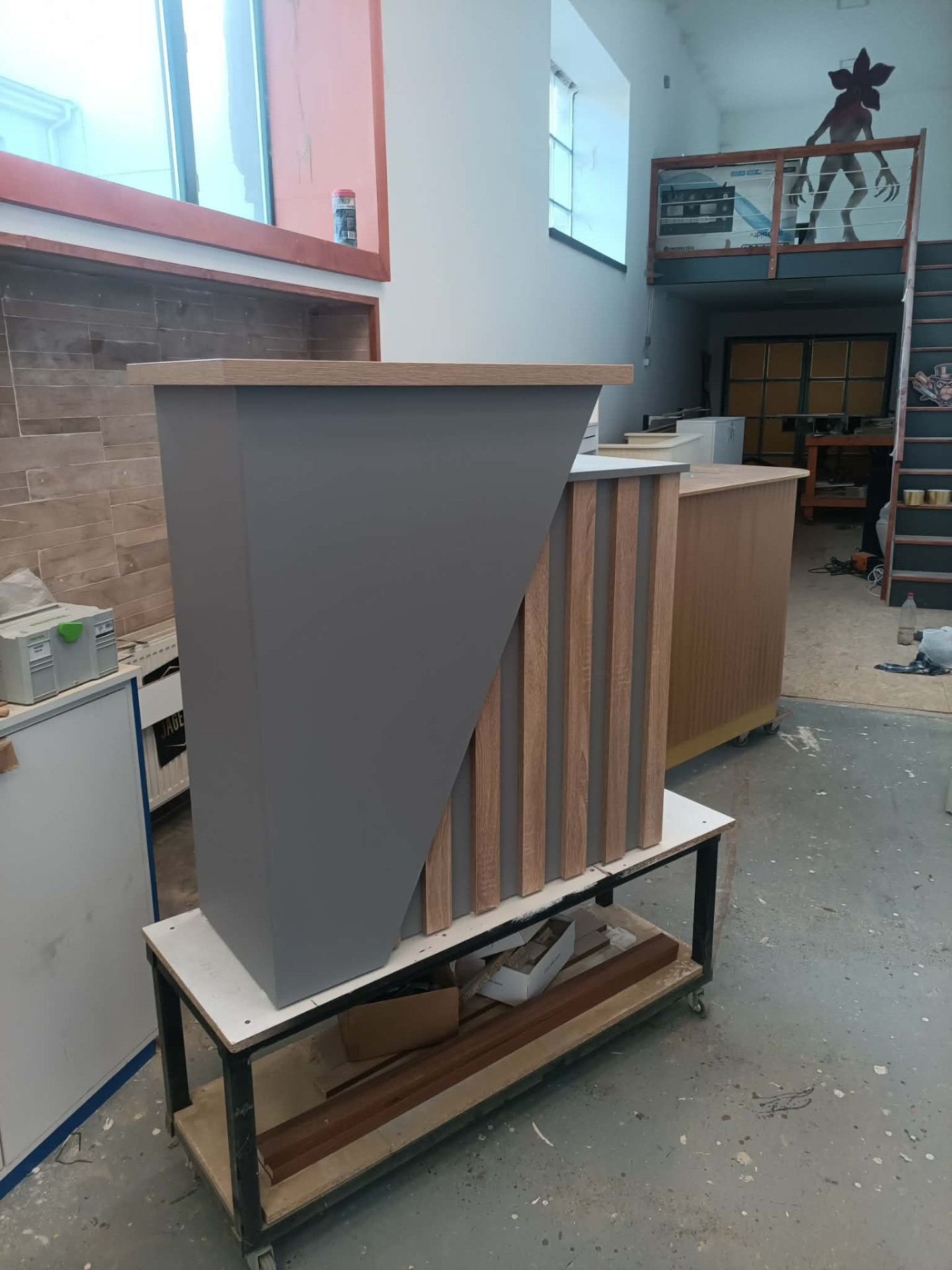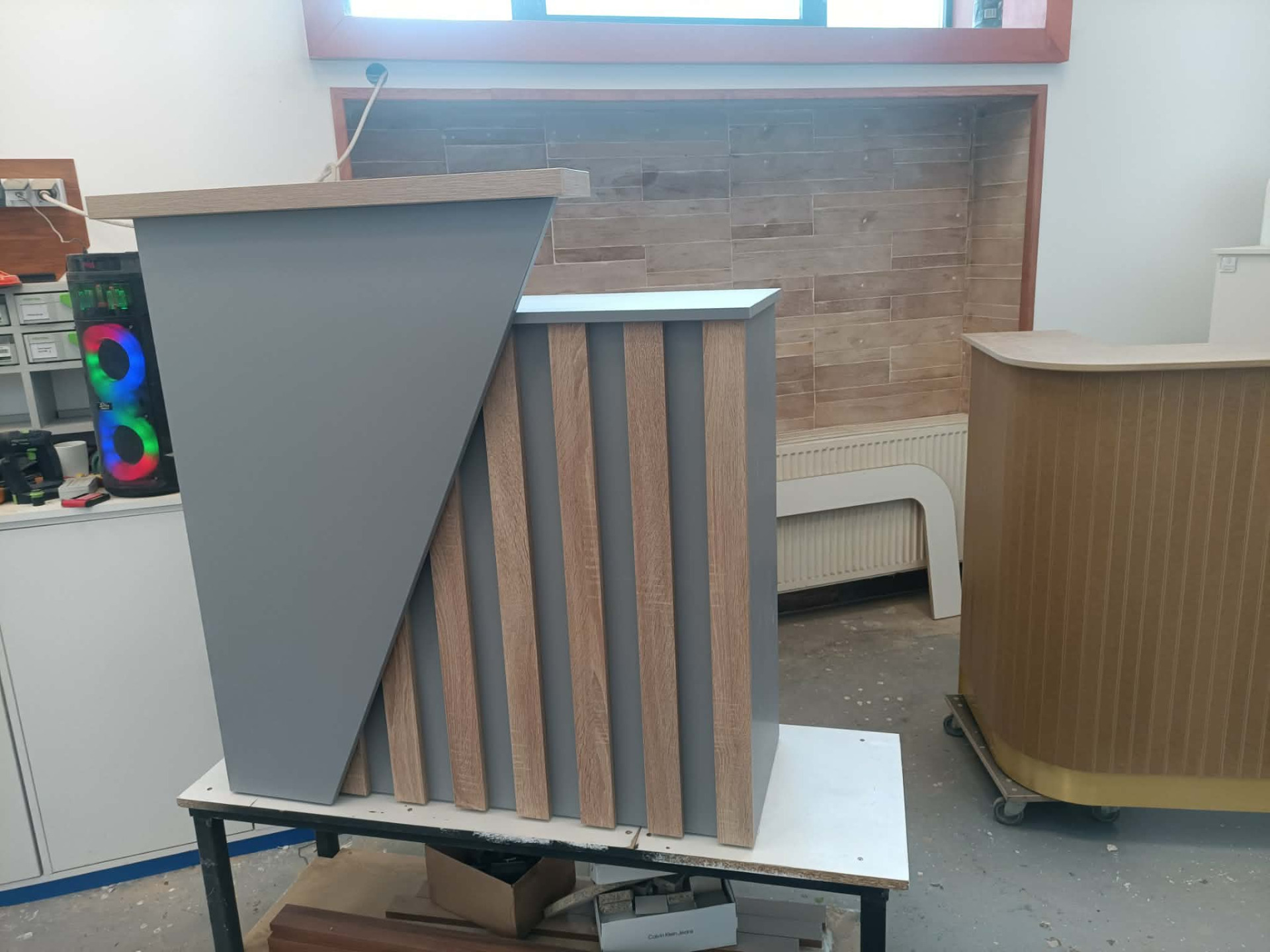 Falco Design Egérszürke 278 FS08 alapfelület,Falco Design Világos Vintage Tölgy 577 FS22 dekorcsíkokkal és könyöklővel. Szélessége 100cm, mélysége 40cm. Pult magassága 90cm, előlap magassága 110cm. Igény esetén kérhető ledvilágítással, illetve belső fiókkal is.